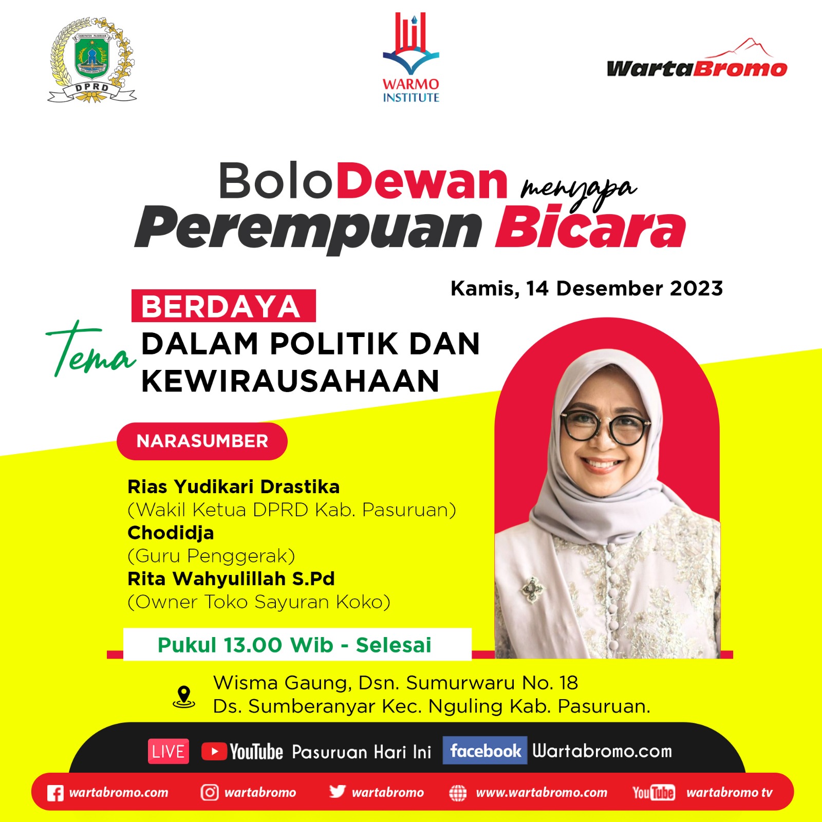 Pasuruan (WartaBromo.com) – DPRD Kabupaten Pasuruan bersama Warmo Institute kembali menggelar Talk Show Bolo Dewan dengan tema “Berdaya dalam Politik dan Kewirausahaan”. Acara bertajuk “Bolo Dewan Menyapa” kali ini akan digelar hari ini, Kamis (13/12/2023) pukul 13.00 di Wisma Gaung, Dusun Sumurwaru, Desa Sumberanyar, Kecamatan Nguling, Kabupaten Pasuruan. Seperti diketahui, pada 2019 lalu, World Bank […]
